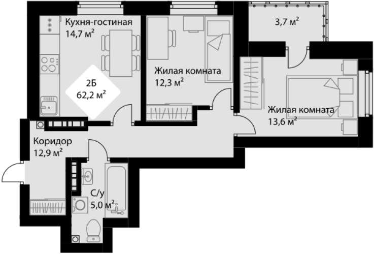 В жилом комплексе большой выбор планировочных решений — от компактных студий до просторных 3х-комнатных квартир. Все лоты сдаются с чистовой отделкой, высотой потолков до 3,02 метров и стандартными окнами.